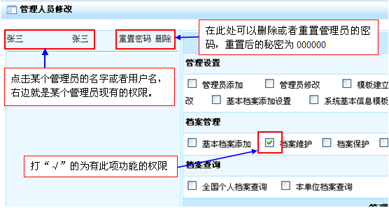 管理人员权限修改:当院校管理人员变动时总管理员可以通过修改或删除功能来重新设置分管理员的管理权限,以达到合理的分配。其中操作设计和管理员添加一样。如图所示: