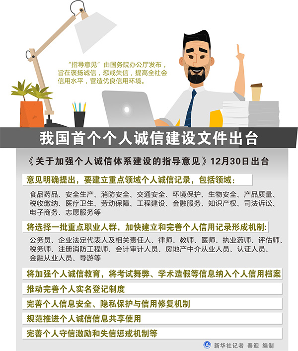 我国首个个人诚信体系建设文件《关于加强个人诚信体系建设的指导意见》30日出台,提出将以重点领域、重点人群为突破口,推动建立个人诚信记录。